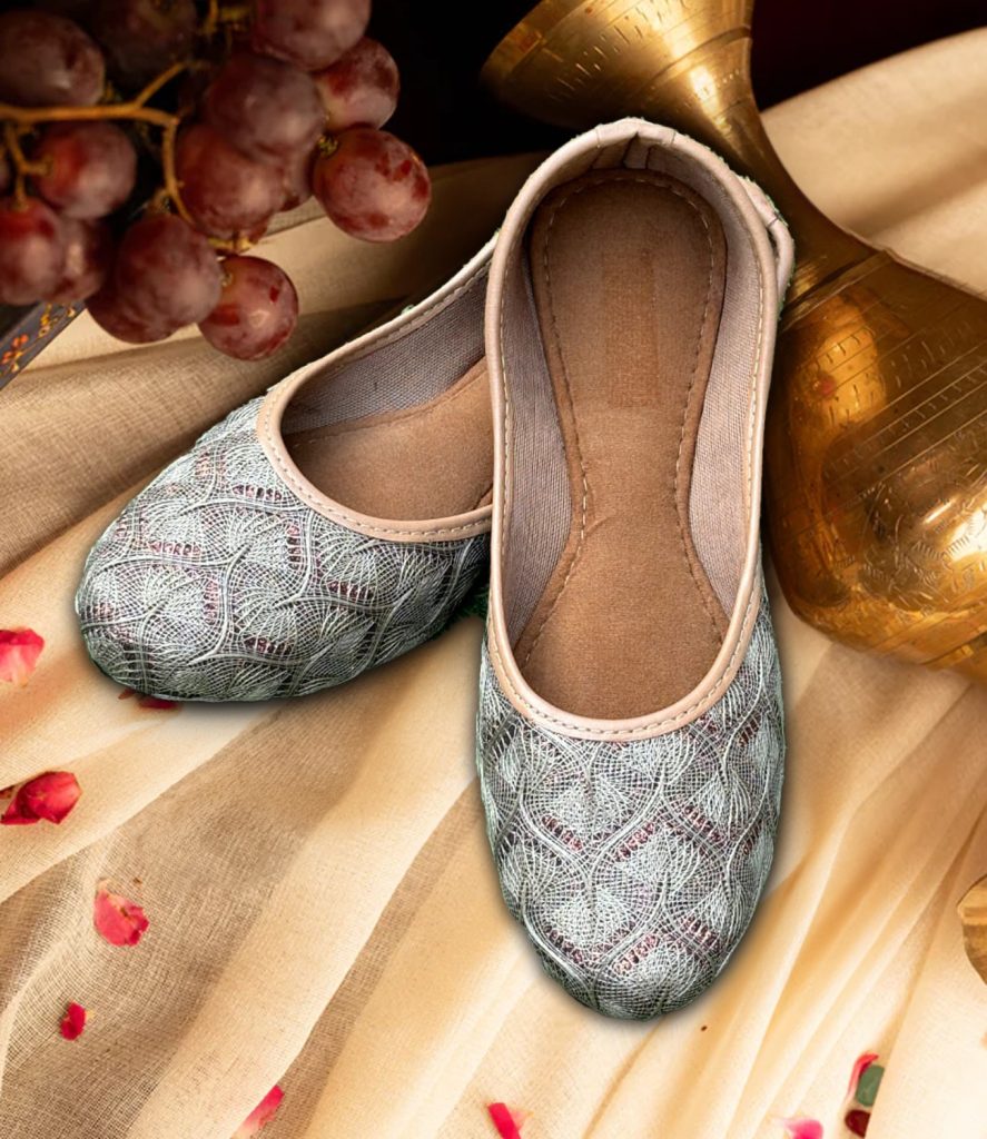Description – Black handcrafted velvet jutti for women, adorned with intricate Floral embroidery work of golden beads. This traditional Indian shoe has a modern twist, making it perfect for any special occasion. The plush velvet fabric and exquisite floral embroidery create a touch of glamour and elegance, adding a luxurious feel to your footwear collection. It is designed to ensure optimum room for ease of movement. Join the league of fashion elites flaunting the staple.