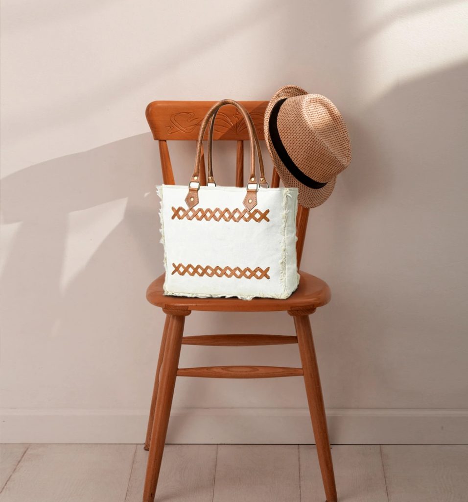 White Handcrafted Canvas Tote Bag with Leather Detailing