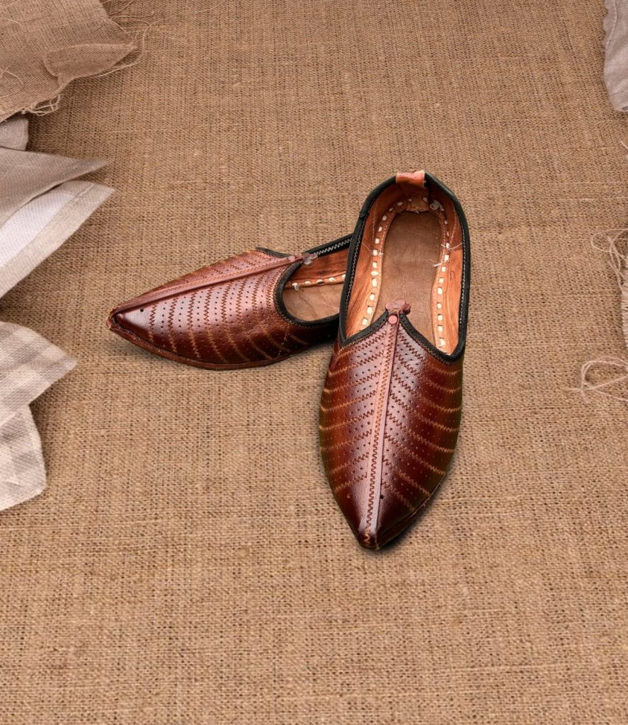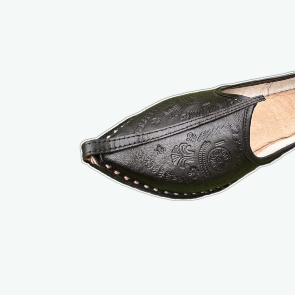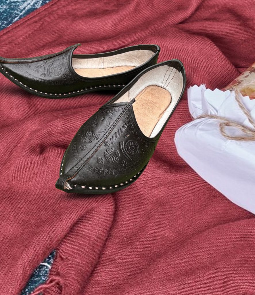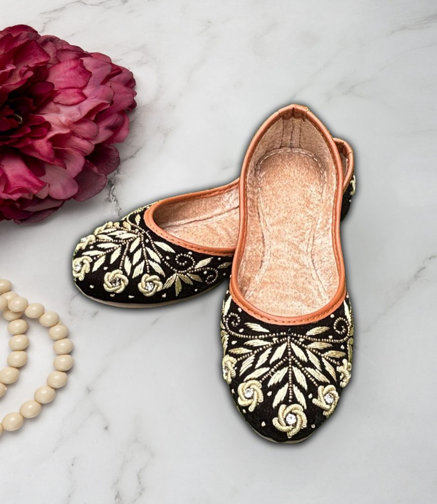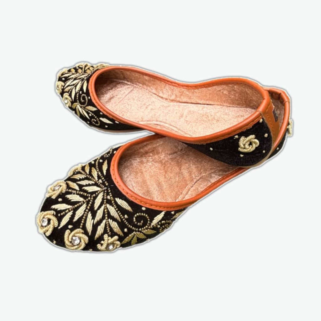 Description – Royal Pink handcrafted velvet jutti for women, adorned with intricate embroidery work of golden beads in necklace design on neck & Back. This traditional Indian shoe has a modern twist, making it perfect for any special occasion. The plush velvet fabric and exquisite embroidery create a touch of glamour and elegance, adding a luxurious feel to your footwear collection. It is designed to ensure optimum room for ease of movement. Join the league of fashion elites flaunting the staple.